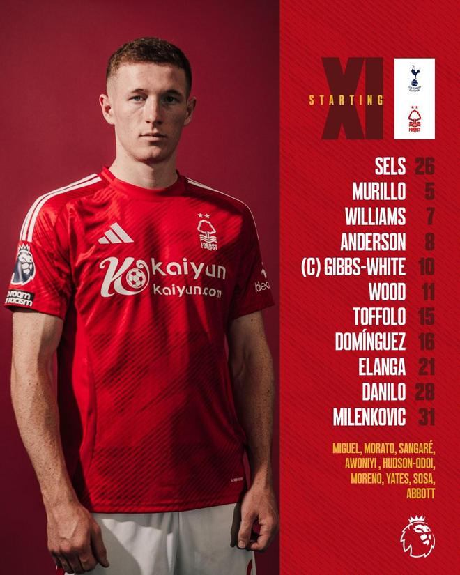 热刺vs森林:里沙利松、奥多贝尔出战,克里斯-伍德首发